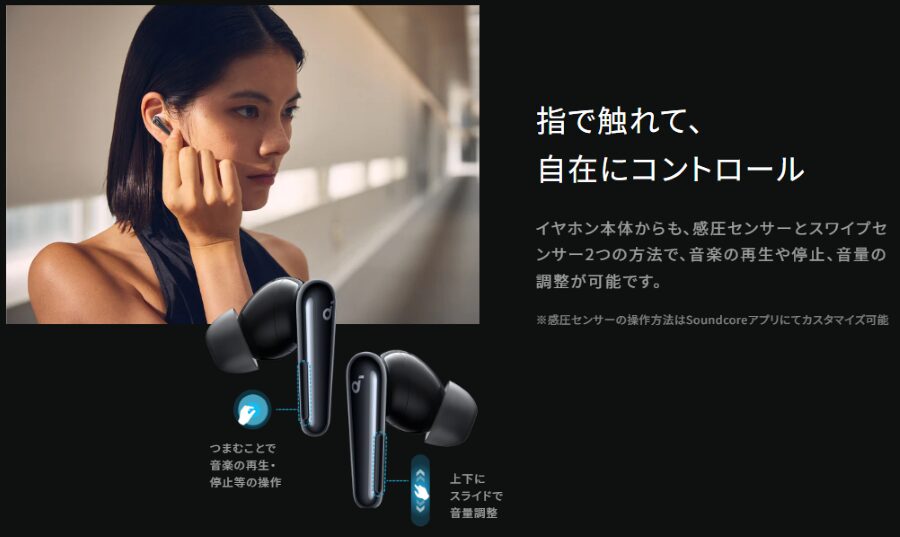 Liberty 5はイヤホン側面を軽くつまむ操作の感圧センサーを採用していて、タップ操作と違って誤操作が起きにくいのが魅力です。